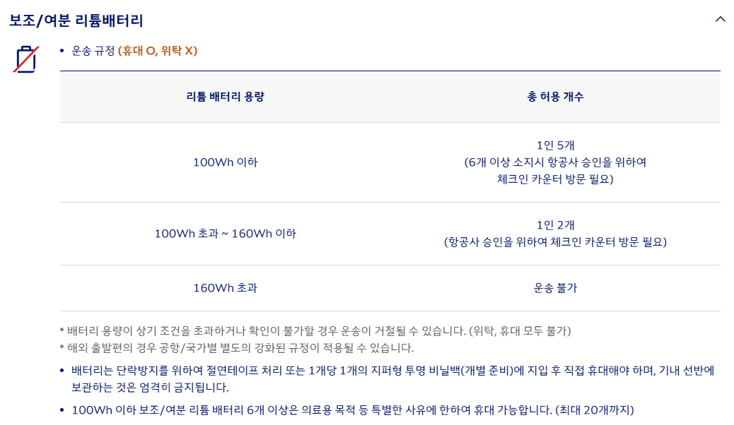 - [대한항공 보조배터리 기내 반입 및 보관 방법](https://www.koreanair.com/contents/footer/customer-support/notice/2025/2502-batteries)